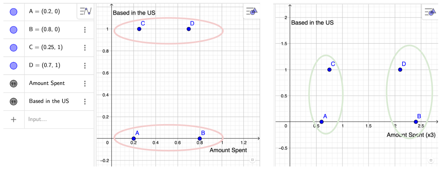 Now, by simply multiplying the value of the amount spent by an arbitrary positive integer, we see how the relative distance between points change, splitting the data by a more “relevant” feature. In the oversimplified example shown previously, only after multiplying the amount spent by 3 (see that values along the y-axis stay the same), the groups end up being split via higher spend vs lower spend, opposed being split based on whether the customer is based in or out of the US.