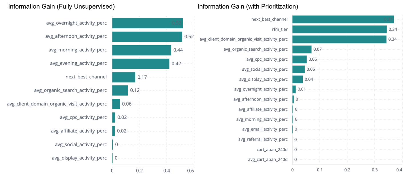 Using simulated test data, we ran two versions of our auto-segmentation model: one fully unsupervised, and one with RFM (recency, frequency, monetary) and a customer’s next best channel prediction prioritized. We then measure the information gain of all features (i.e. how much a feature contributes to the separation of groups) and the resulting bar graphs comparing the two models.