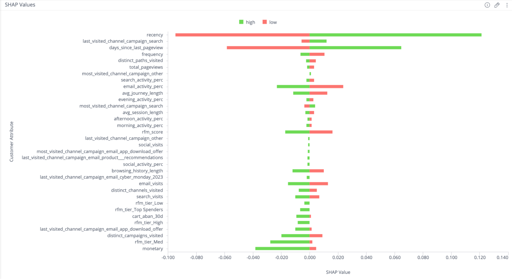 The typical Beeswarm plots that depict Shapley Values are extremely useful, but can be memory and computationally intensive. To circumvent this, we save the average high and low Shapley values per feature per cluster for analysis. In the example that follows, showing the Shapley values for a specific cluster, we see users in this cluster can be characterized by high recency (which concurs with the third-highest feature counting the days since last pageview), and having their last channel being campaign search.