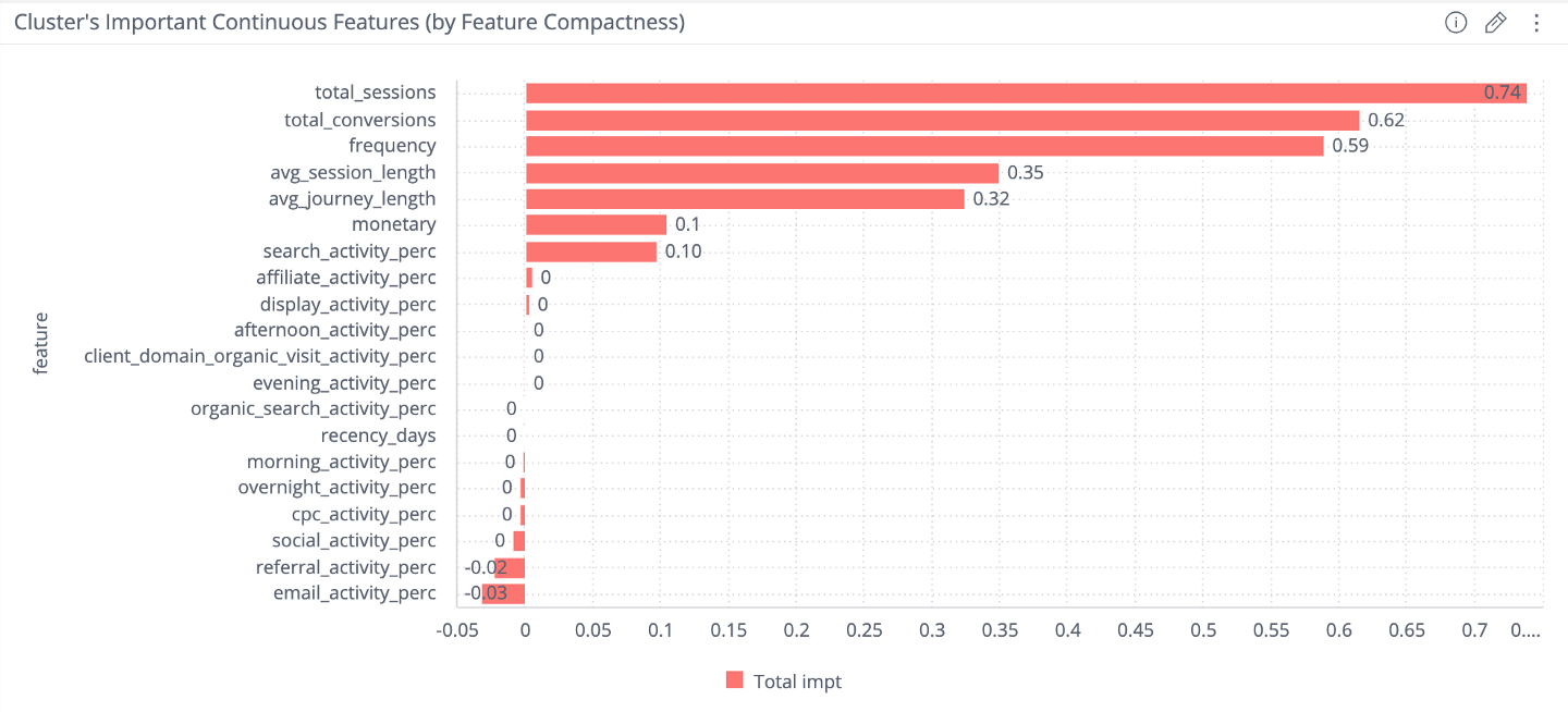 Relative feature compactness basically measures the relative standard deviation of a feature across each cluster and the entire input dataset. The intuition behind this is if the standard deviation of a feature is much smaller in a single cluster compared to the population, that feature is more likely able to be used to characterize that cluster. For example, if CLTV (Customer Lifetime Value) is distributed fairly evenly from 0–100, it would have a relatively large standard deviation. If Cluster 1 has a CLTV range of 80–100, it would have a relatively lower standard deviation compared to the population, so CLTV might be a good descriptor of the cluster, i.e. Cluster 1 has customers with high lifetime value.