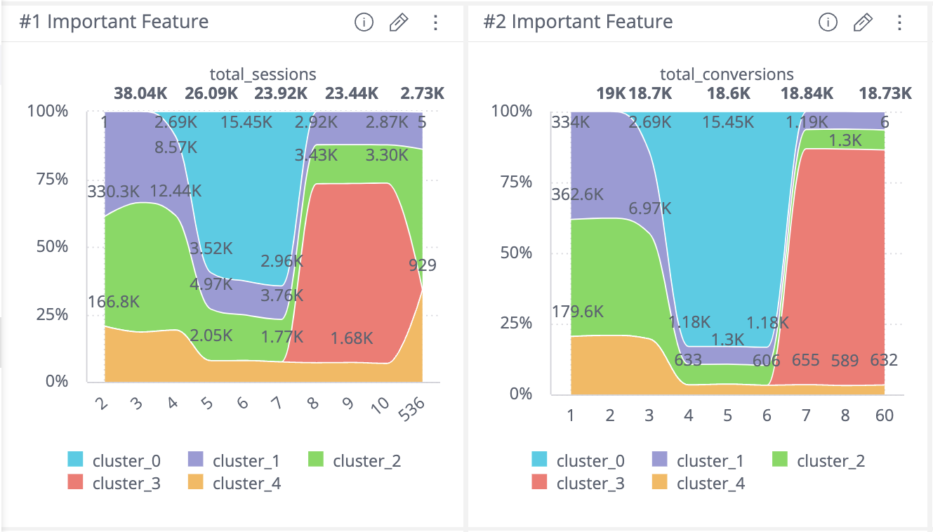 Combining the ranked feature compactness with any visual that represents the distribution of the feature amongst the different groups produced by Auto-Segmentation makes it easier to characterize each group. For example, the following screenshot shows the distribution of the top two most relatively-compacted features for cluster_3. A meaningful description of this cluster could then be something akin to: customers with 8–10 total sessions and more than 6 conversions.