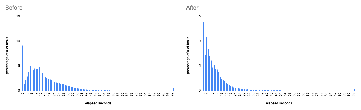 So what is the net impact of these architecture changes? We observed Map tasks of Hive on Tez became much faster, especially when they access a large number of S3 objects or columns. The latency distribution apparently improved after the rollout. We know some Map tasks became 10x faster and those of typical CDP queries became 20~30% faster on average as announced in our monthly release notes.