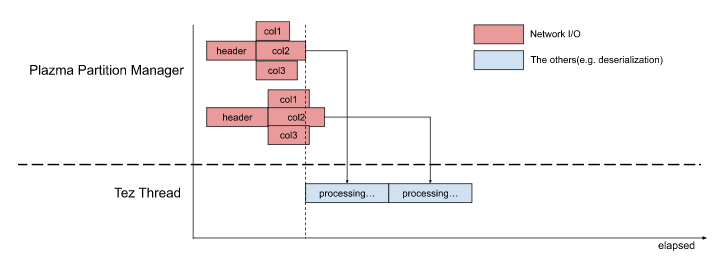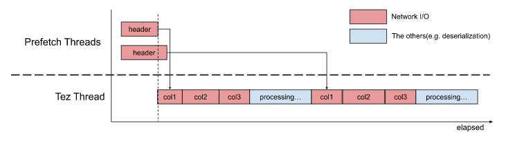 This architecture had slightly reduced latency of Map tasks with fairly simple implementation. But we knew typical table scans still spent 20~30% waiting for column blocks. In actual cases, a single Map task can touch much more S3 objects or read more columns than the above image, and S3 access could block the primary thread of Tez. Theoretically, the 20~30% can be almost zero.