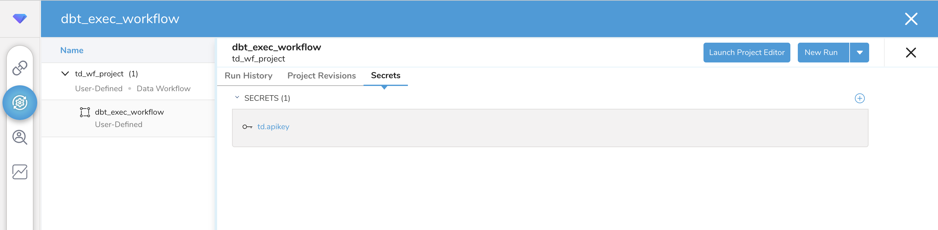 td_wf_project/dbt_exec_workflow.dig.+dbt_invoke: py>: scripts.dbt_wrapper.invoke _export: command_list: - run _env: TD_API_KEY: ${secret:td.apikey} docker: image: "digdag/digdag-python:3.10"Replace the TD API Key, previously set in user