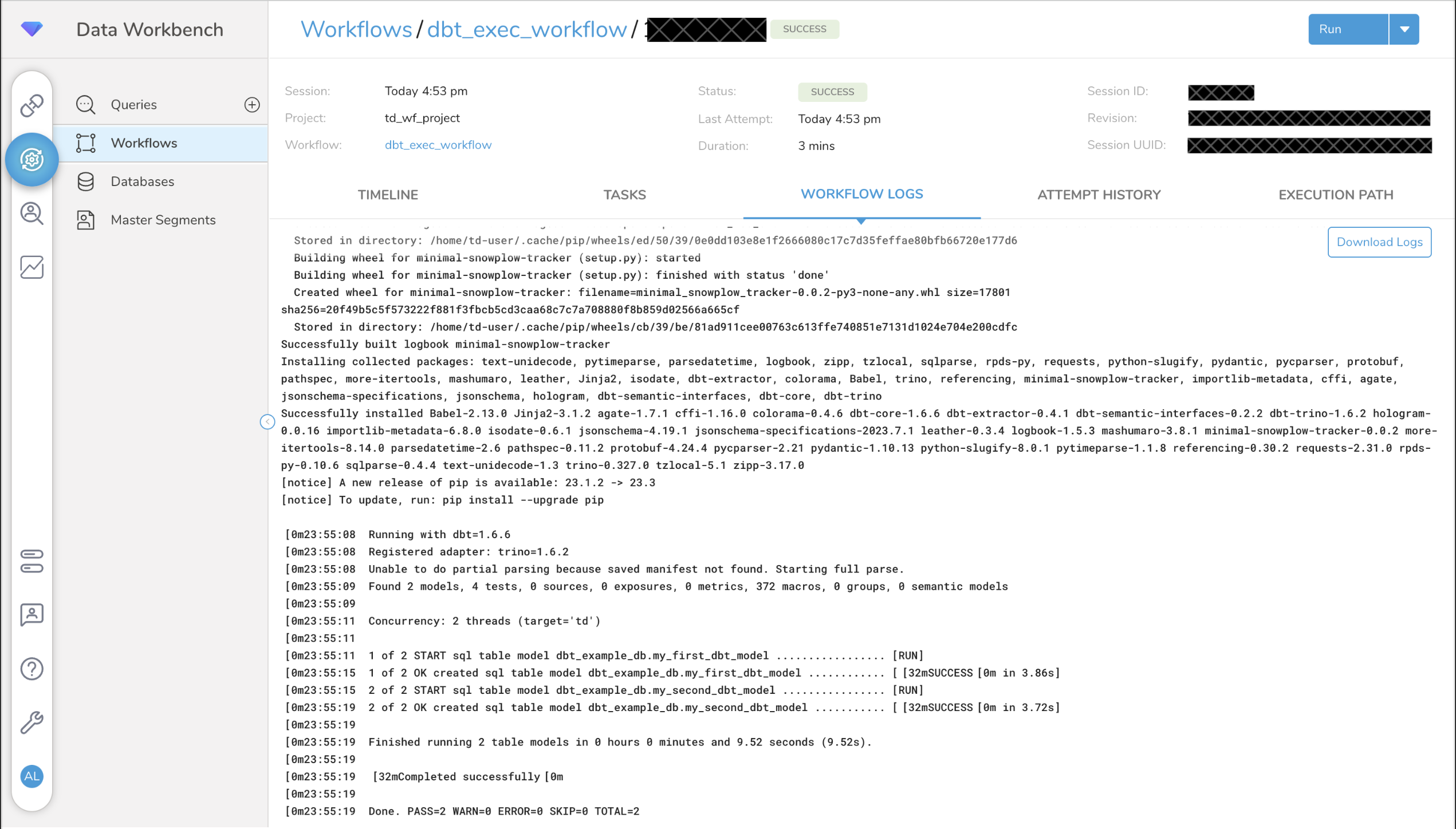 td_wf_project ├── dbt_exec_workflow.dig ├── dbt_packages ├── dbt_profiles │ └── profiles.yml ├── dbt_project │ ├── README.md │ ├── analyses │ ├── dbt_project.yml │ ├── macros │ │ └── td_adapter_patch │ │ └── adapters.sql │ ├── models │ │ └── example │ │ ├── my_first_dbt_model.sql │ │ ├── my_second_dbt_model.sql │ │ └── schema.yml │ ├── seeds │ ├── snapshots │ └── tests └── scripts └── dbt_wrapper.pyRun the workflow (