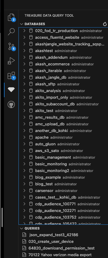 - After installing the extension, you will see the Treasure Data sidebar icon. Click on it to reveal the list of databases, tables, and saved queries.