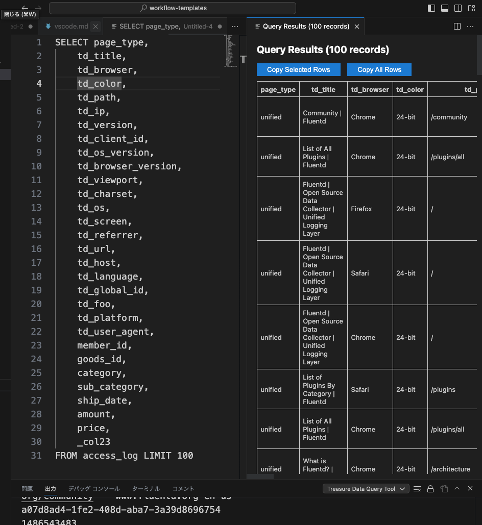 TDQT: Run Query. Select this command to start a new job on Treasure Data with the query from the current window. - An output window will show the progress of the job as it runs on the Treasure Data service.